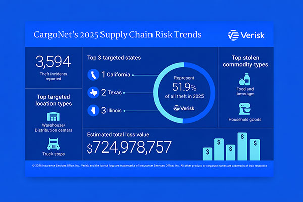 Verisk CargoNet’s annual analysis shows cargo theft losses across the U.S. and Canada surged about 60% in 2025 to nearly $725 million, even though the total number of supply chain crime events stayed roughly the same. Confirmed cargo thefts increased 18% (from 2,243 to 2,646 incidents) and the average loss per theft jumped 36% to around $273,990.