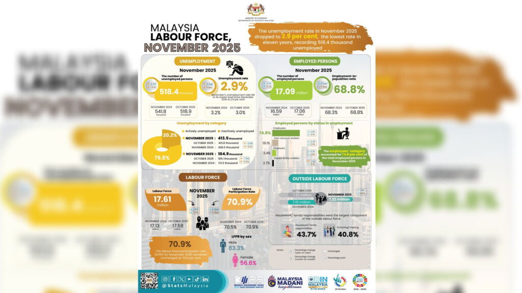 Malaysia’s unemployment rate dropped to 2.9% in November 2025 — the lowest since November 2014 — according to the Department of Statistics Malaysia (DOSM). That figure corresponds to 518,400 unemployed persons, with the labour force rising to 17.61 million and the labour force participation rate holding at 70.9%.
