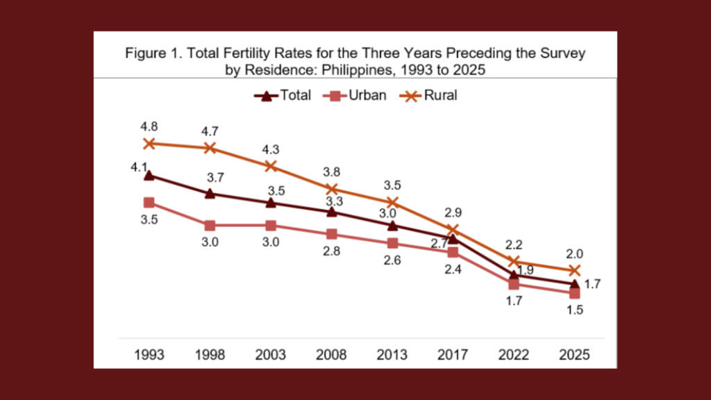 The 2025 National Demographic and Health Survey (NDHS) reports a continued fall in the Philippines’ total fertility rate (TFR). For women aged 15–49, TFR for the three years before the survey (roughly 2022–2025) is 1.7 children per woman, down from 4.1 in 1993. Fertility remains higher in rural areas (2.0) than in urban areas (1.5), but both have declined sharply since the early 1990s.